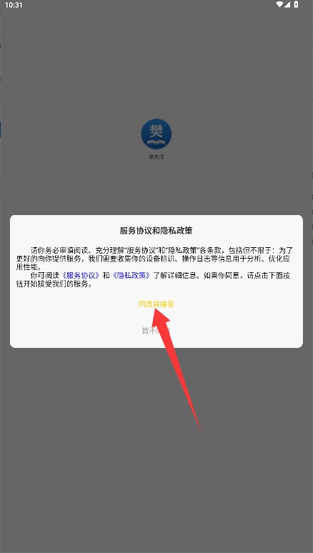 一、首次应用需浏览用户协定与隐衷政策,确认无误后点击许可并接受按钮进入。
