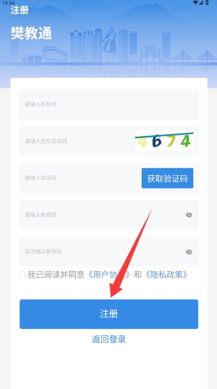 三、输动手机号、图形考证码以及短信考证码并配置明码,勾选许可协定后点击注册。