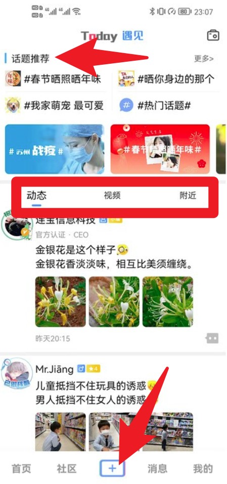 2. 切换至圈子页面,浏览内陆用户宣布的消息、视频或者邻近生涯信息,点下方+图标可快速发帖互动。