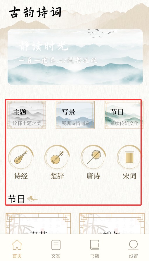 二、首页供应主题分类浏览性能,涵盖写景、节日及诗经楚辞等文学题材。
