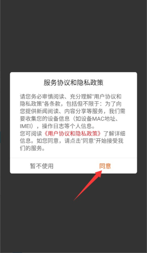 一、首次启动应历时,需浏览并许可用户效劳协定及隐衷条款,点击确认落伍入主界面。