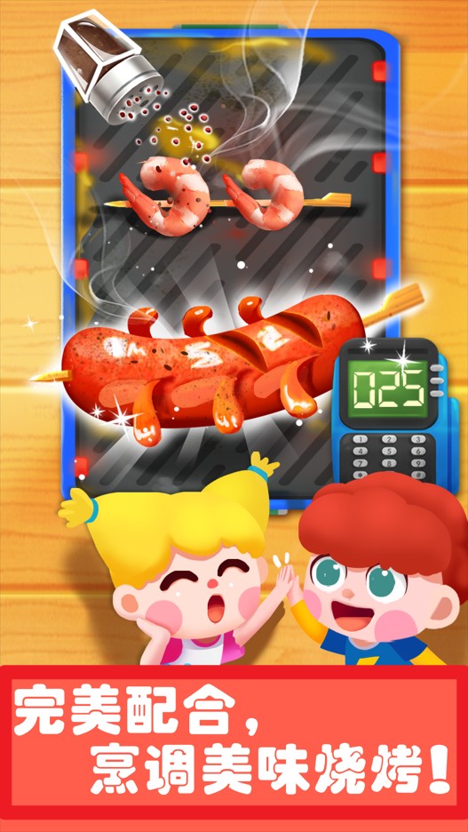 1. 点击烧烤摊位,自在搭配喷鼻肠与海鲜,调味加热后就可实现美味烧烤。