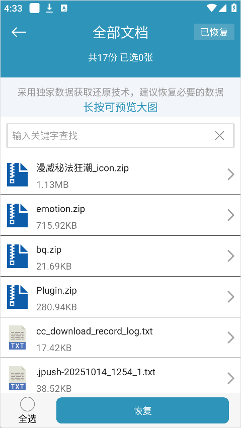 三、确认抉择无误后,点击界面底部的"复原"按键,系统即会快速重修丢失的文档内容。