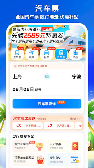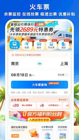 铁行火车票是一个聚合多品类出行效劳的综合性平台。营业涵盖火车票、机票、租车、旅店及景点门票的在线预订,通过整合多方资本实现一站式出行布局。新注册的持有者可获取蕴含租车抵用券在内的优惠礼包,帮助勤俭出行老本。有需要的小伙伴能够点击下载。