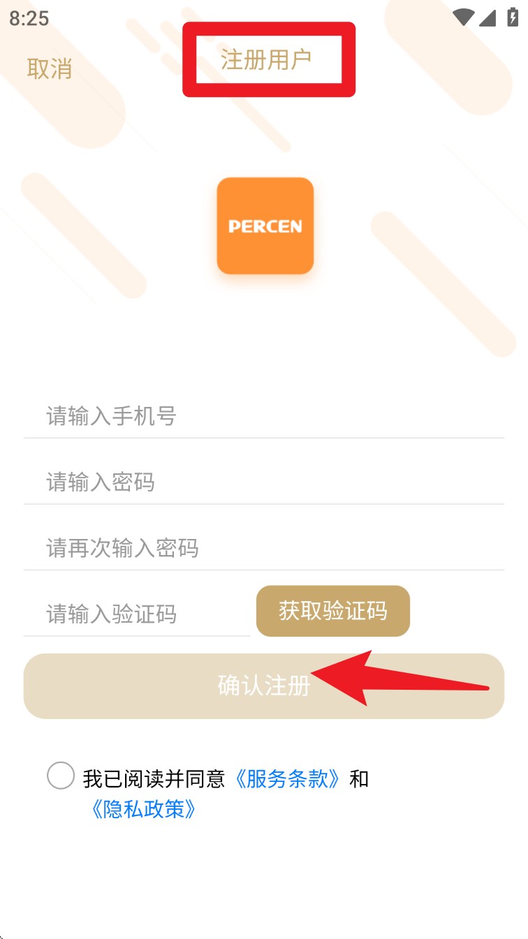 1. 关上App抉择注册用户,输动手机号、明码以及考证码后点击确认注册。
