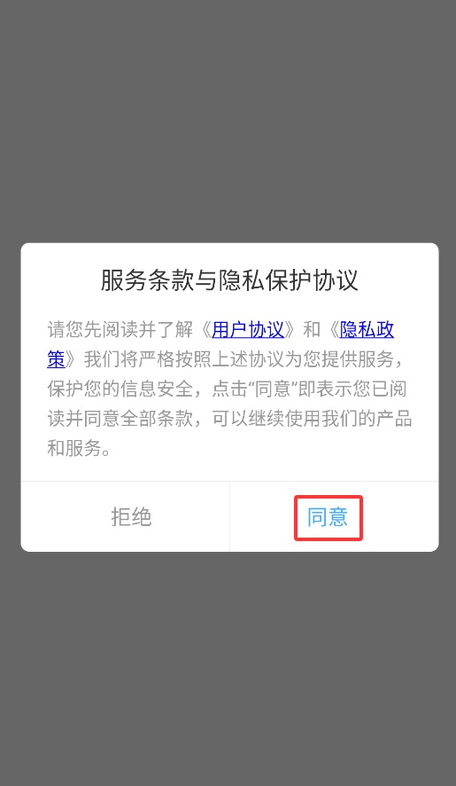 一、首次启动APP时需点击许可用户协定弹窗,方可进入主界面最先应用。