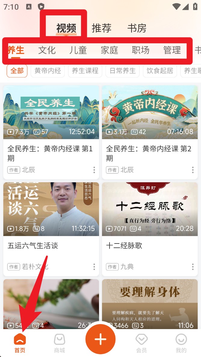 1. 在底部点击首页,进入主界面后,可切换顶部视频、推举等频道,并在下方浏览各种分类内容与推举课程。