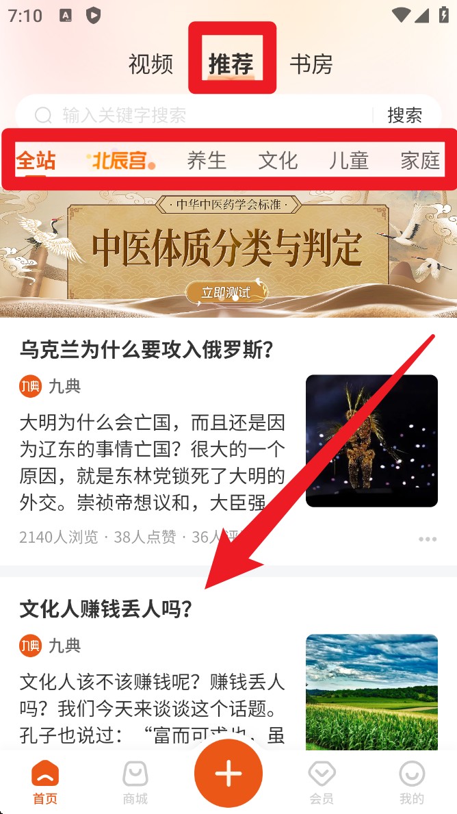2. 切换至推举标签页,可检察文章内容与图文资讯,也能依兴趣点选上方的分类标签如北辰宫、养生、野蛮等。