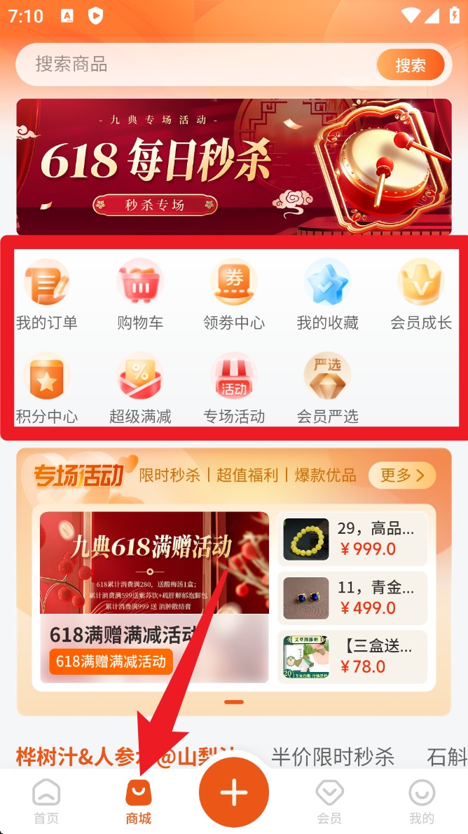 3. 点选下方的商城图标,进入九典电商专场,可浏览以后匆匆销静止、商品推举以及会员专属福利内容。