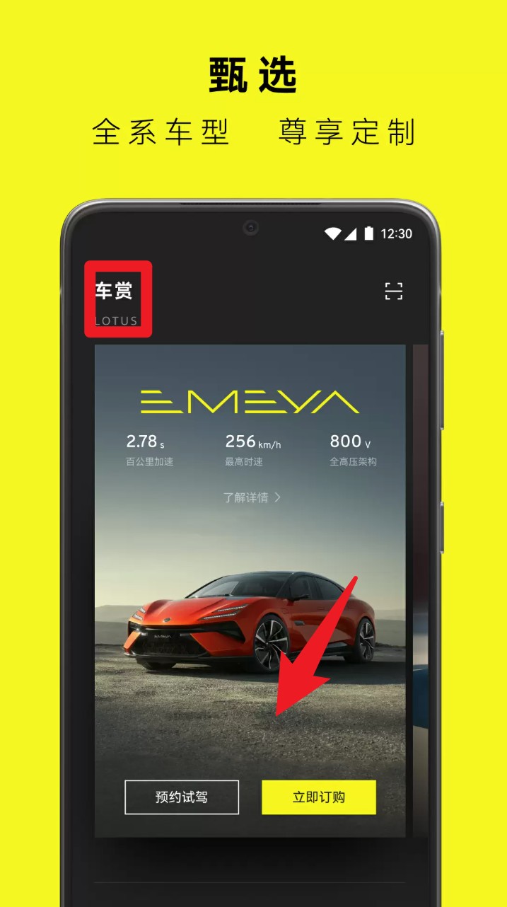 1. 在首页点击车赏模块进入车型详情页面,浏览EMEYA性能参数后可抉择预约试驾或者立即订购。