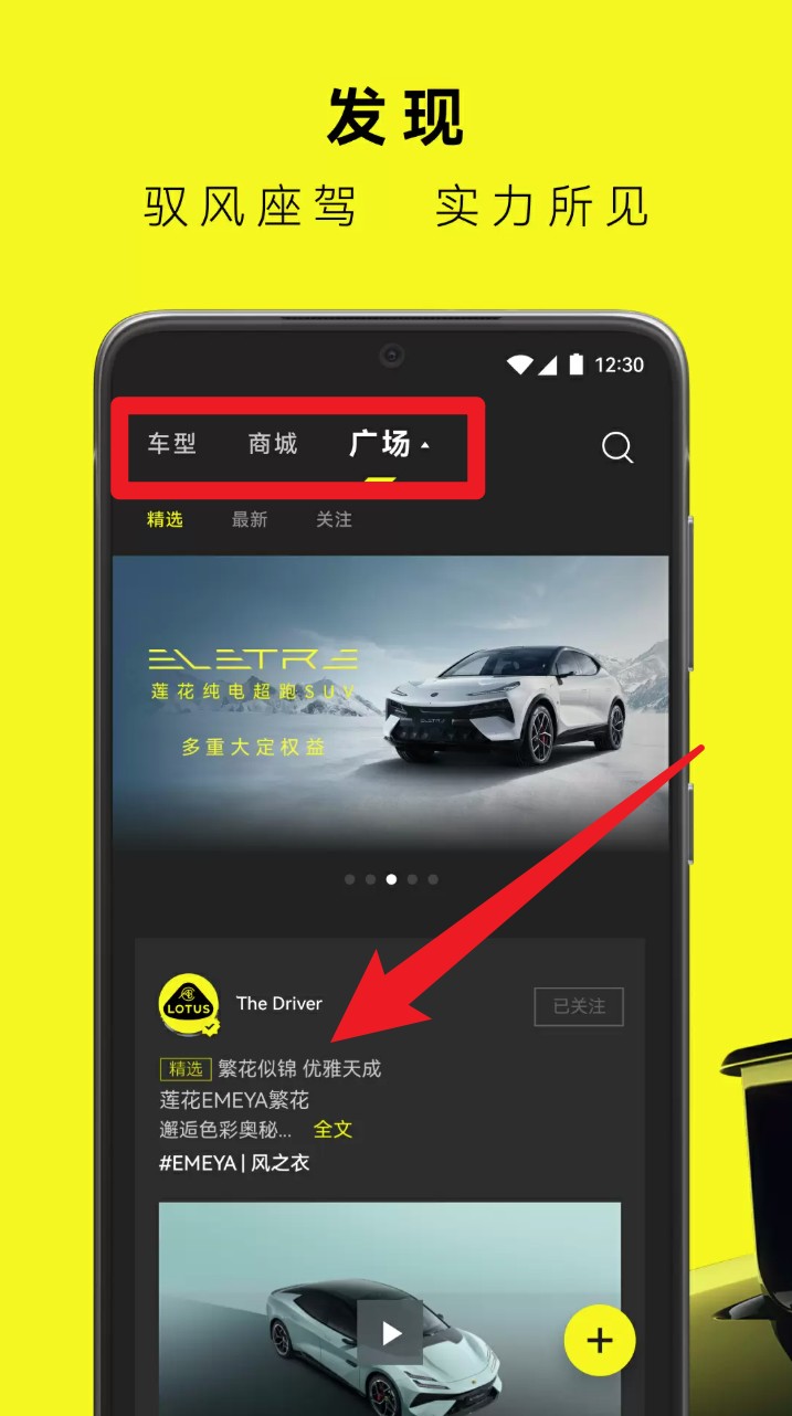 2. 点击底部广场标签,浏览精选内容、车型资讯与车踊跃态,反对于关注宣布者并互动谈论。