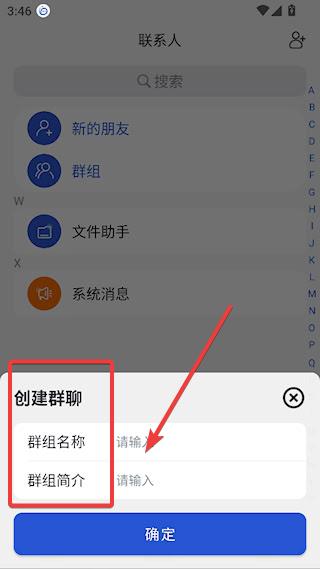 四、依据提醒顺序输入【群组名称】【群组简介】