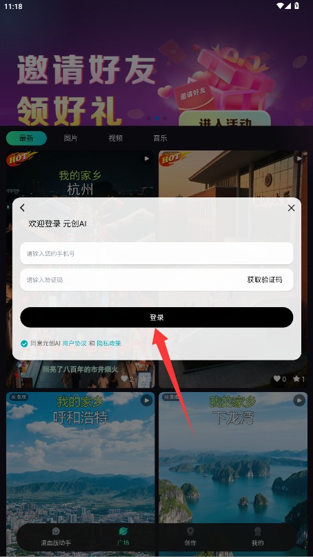 二、在登录页面输动手机号以及考证码,勾选许可平台相干协定后点击登录进入应用。