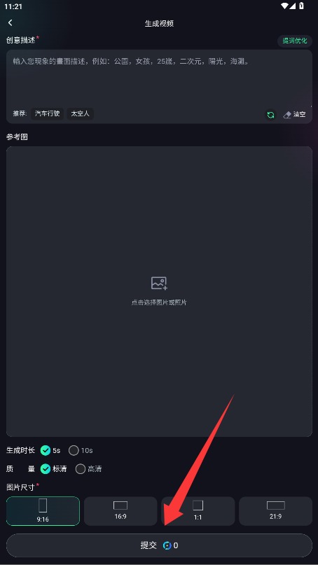 四、输入视频创意文字形容,上传参考图片并调解参数配置,确认后提交天生作品。