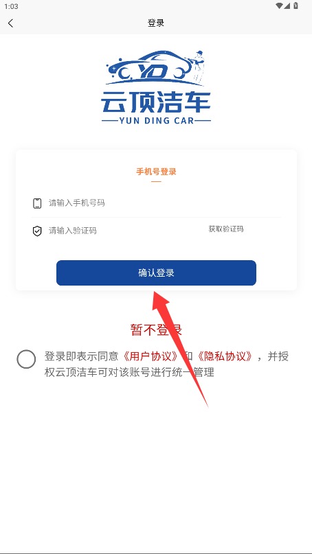 二、在登录界面输动手机号以及考证码,勾选许可协定条款后点击登录按钮进入应用。