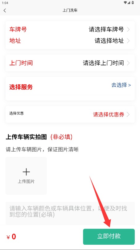 四、完好填写车牌号码、效劳所在及预约时日,上传车辆照片后实现支付预约操纵。