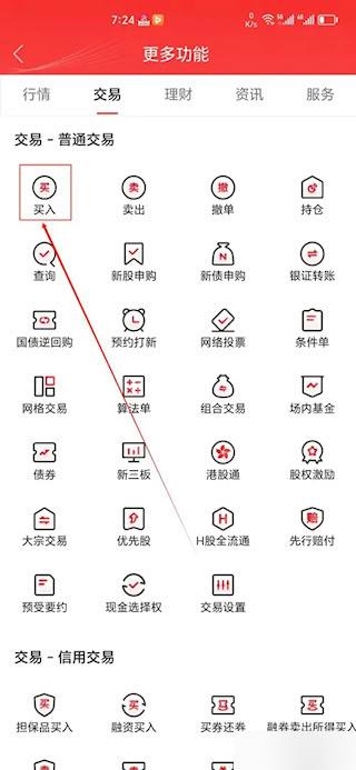 三、在开展的性能菜单中,抉择“买入”性能项,点击后系统将跳转至买卖界面,在此可实行细致的托付下单操纵。