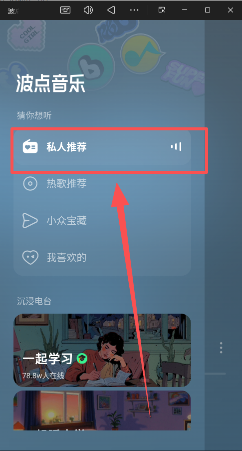 在首页浏览“私人推举”或者“猜你想听”栏目,间接点击歌曲就可播放。