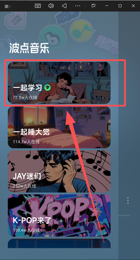 点击进入如“一起学习”等房间,就可与房间内的其余听众同步收听统一份歌单,感受集体气氛。