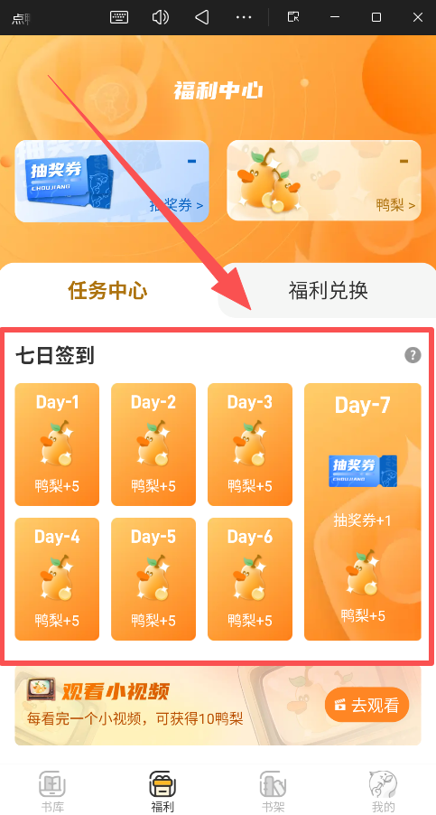 进入 “福利” 核心,通过逐日签到以及寓目小看频来积累“鸭梨”,为后续浏览储备“弹药”。