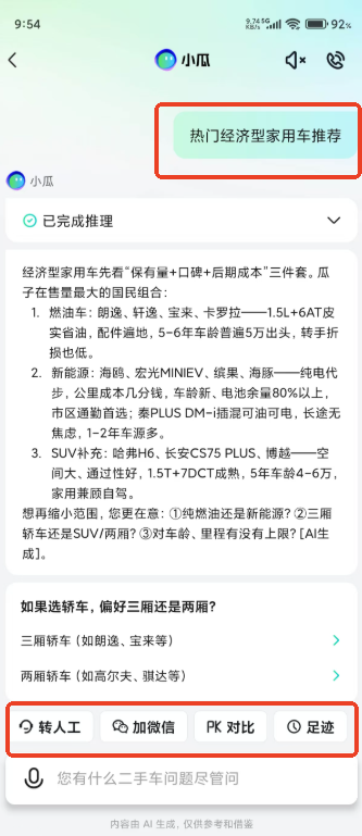 3.依据你的动向与需要停止形容,ai会为你推举最适宜的车辆,不骄傲也能够转人工在线咨询,让每一位用户都能买到最具性价比的车辆。