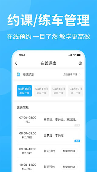 二、 教练宣布可约练车的时日段,学员在线实现预约,日程布置清晰明白。