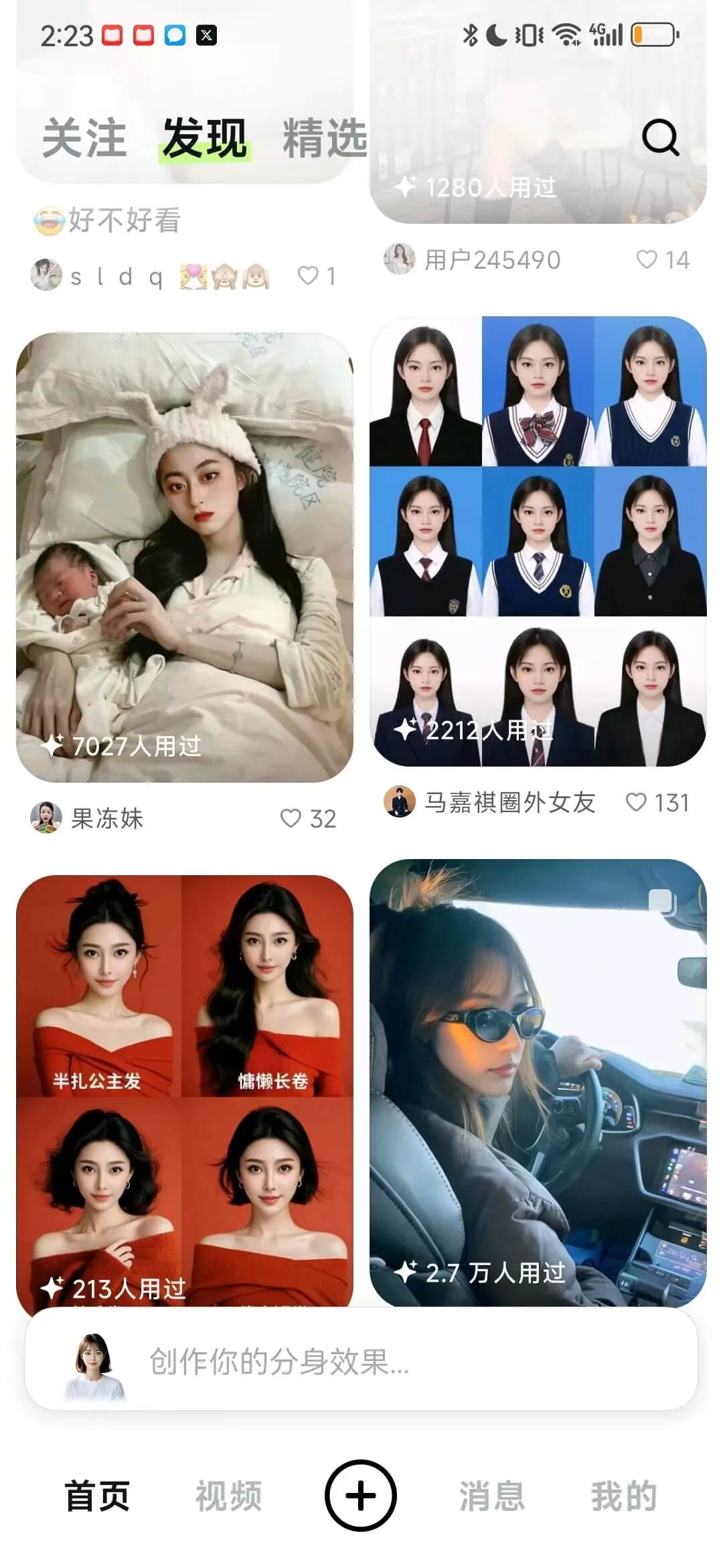 在精选页面,还能创造视频,换装(非齐全对于抗),特效,滤镜,改图,扩图,实在都挺基础的啦,无非很便利便是了,主打照样咱们的那张脸嘛,人人自身试试就行