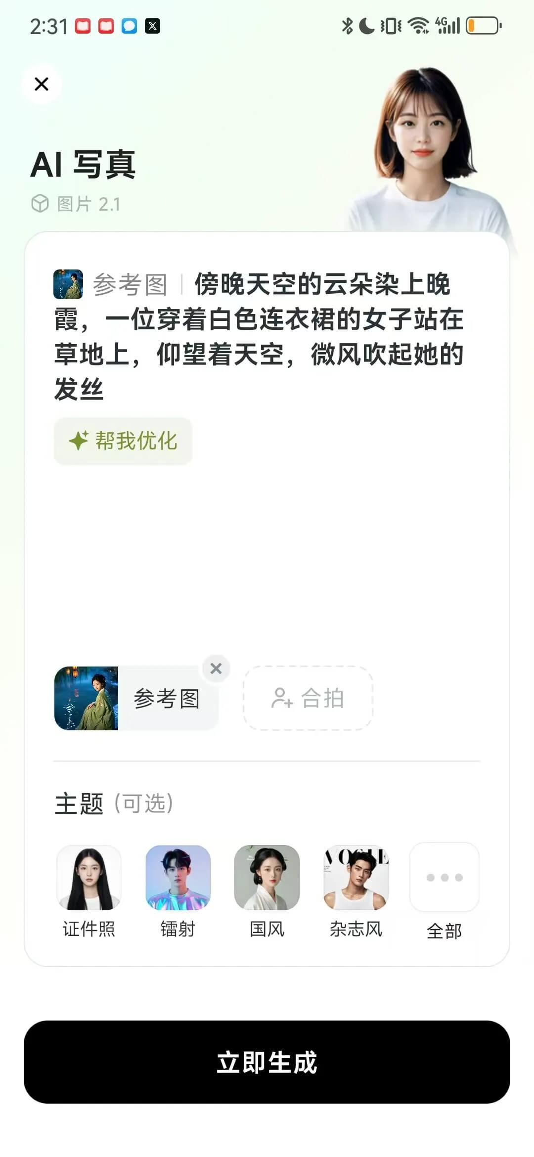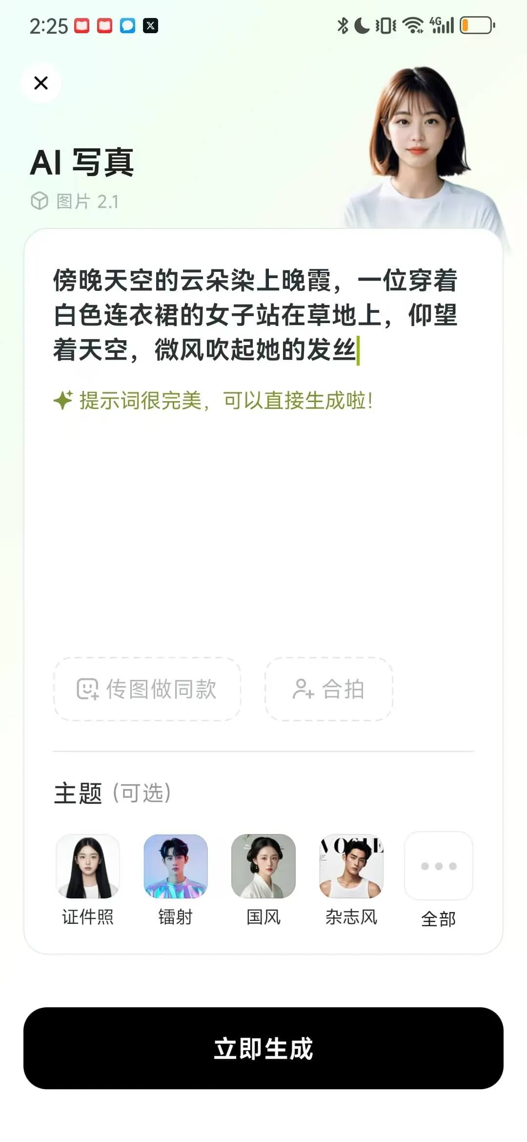 提醒词均可随机浮现症结场景主动增补,下方主题也能抉择,至于传图做同款就更有趣了,这个特点许可你上传任意带脸(能够是虚构形象),以至仅是一件衣物,都能作为参考图像