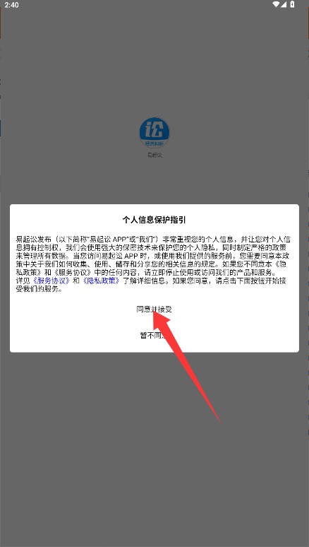 一、首次应用需浏览用户协定与隐衷政策,确认无误后点击许可并接受按钮进入应用。