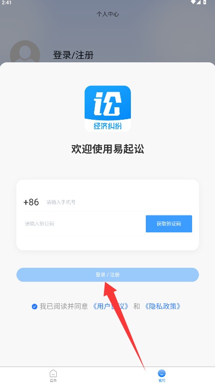 二、在登录页面输动手机号以及短信考证码,勾选许可相干条款后点击登录/注册按钮进入。