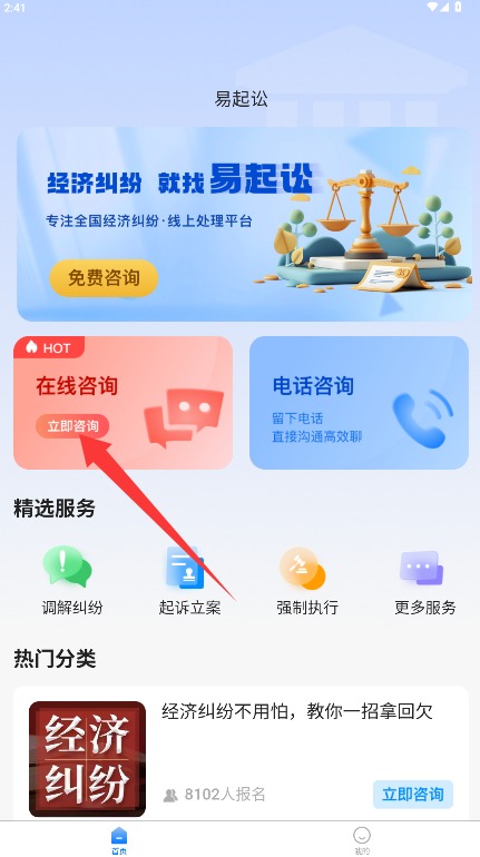 三、进入应用主界面后,抉择在线咨询性能模块,点击进入最先法律咨询流程。