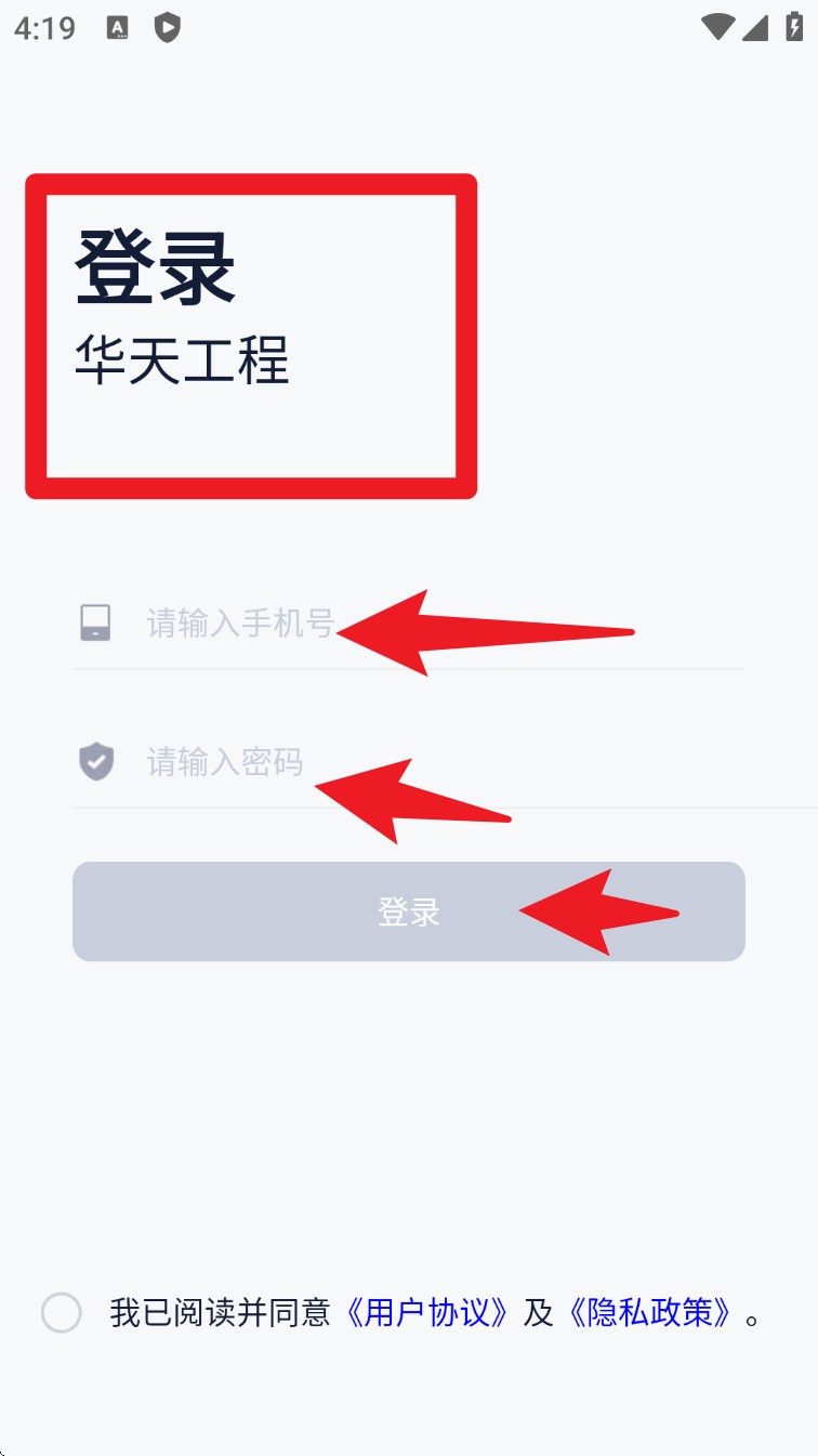 1. 关上App以后,输动手机号与明码登录,勾选协定后点击下方按钮实现考证。