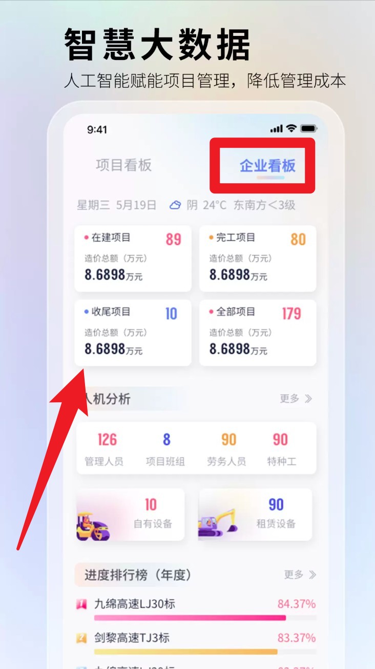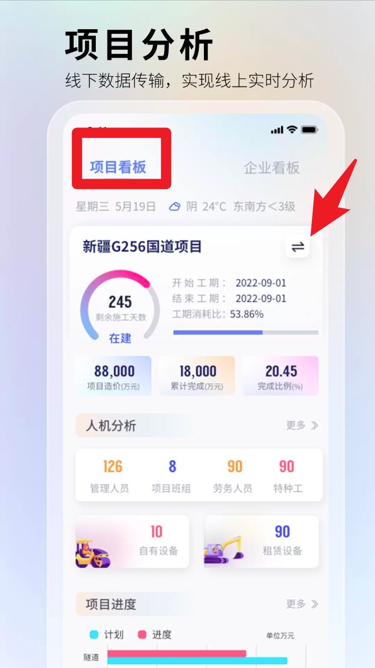 3. 点击名目看板切换检察细致工程数据,蕴含进度、造价、职员设施等实时更新内容。