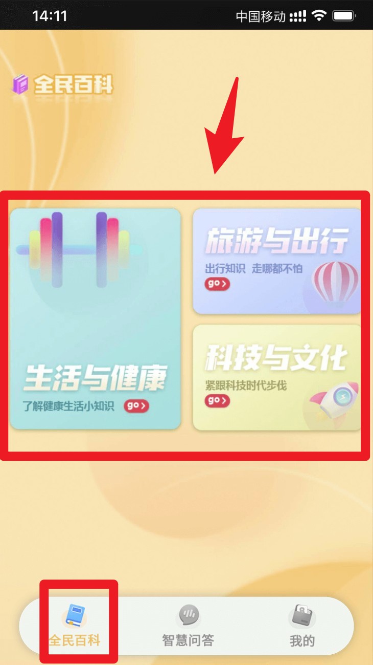 1. 在首页点击左下角的全夷易近百科模块,进入后可抉择生涯衰弱、游览出行、科技野蛮平分类内容停止浏览。