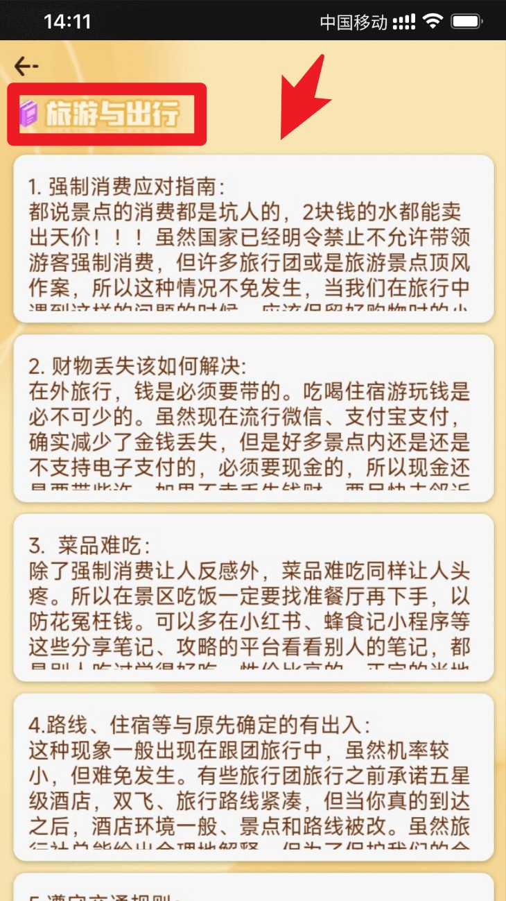 2. 进入游览与出行栏目后,将看到罕见游览问题的应答指南,囊括生产陷阱、财物丢失、饮食发起等资讯。