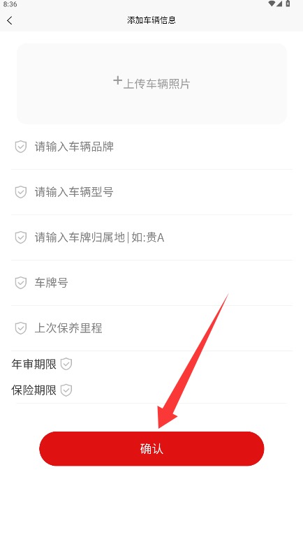 四、上传车辆照片、输入车辆品牌、车辆型号、车牌归属地以及车牌号等信息点击确认。