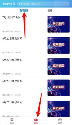 三、点击底部菜单栏视听并进入看电视栏目,能够回看拜泉音讯视频,了解逐日音讯内容。