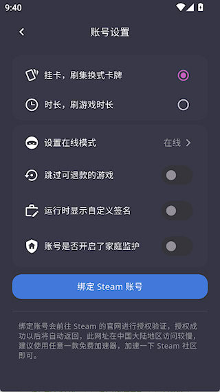 云挂卡是一款Steam游戏协助应用,面向学业或者事件忙碌的游戏玩家,借助云端效劳器与Steam民间API,杀青全主动集换式卡牌收罗、游戏时长积累等操纵,不占用内陆设施资本,无需后盾连续运行,账号绑定后可挑选多种挂机形式,搭配全天候失落线展现,操纵省时进程费心。