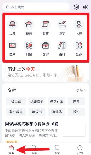 二、首页展现多个知识分类进口,点击可快速浏览教诲、医学、百科、历史等各畛域资料内容。